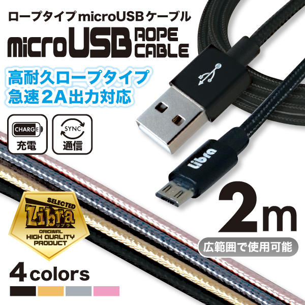 高耐久ロープタイプ、2A急速充電対応のmicroUSBケーブル